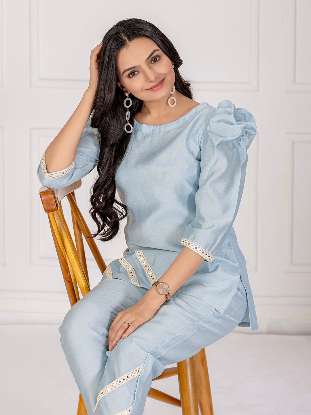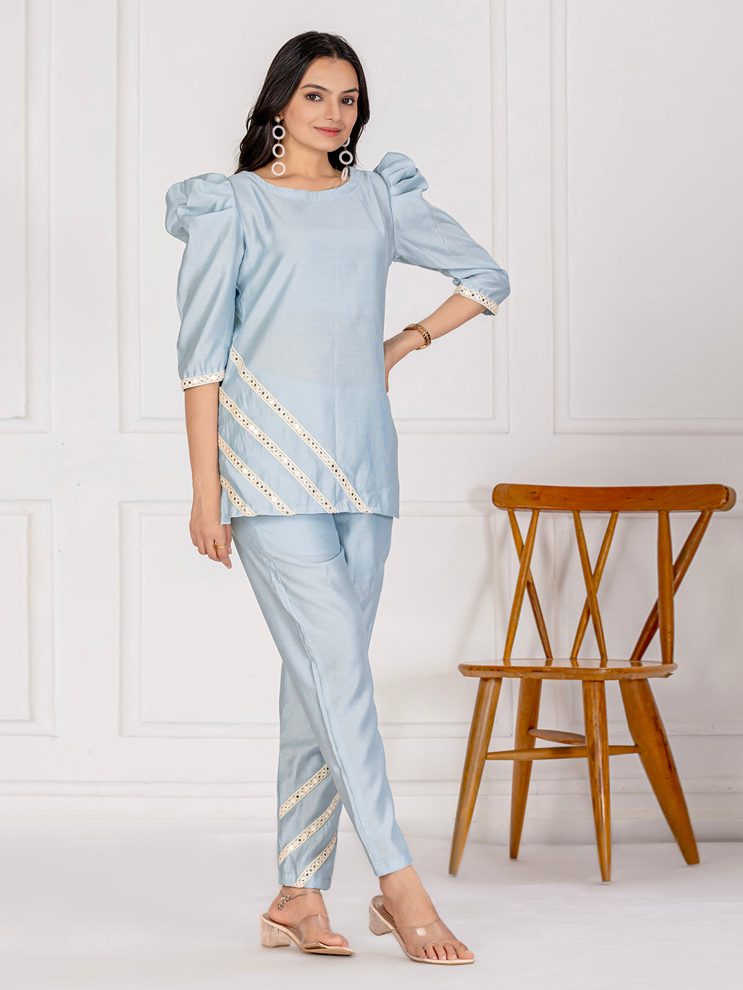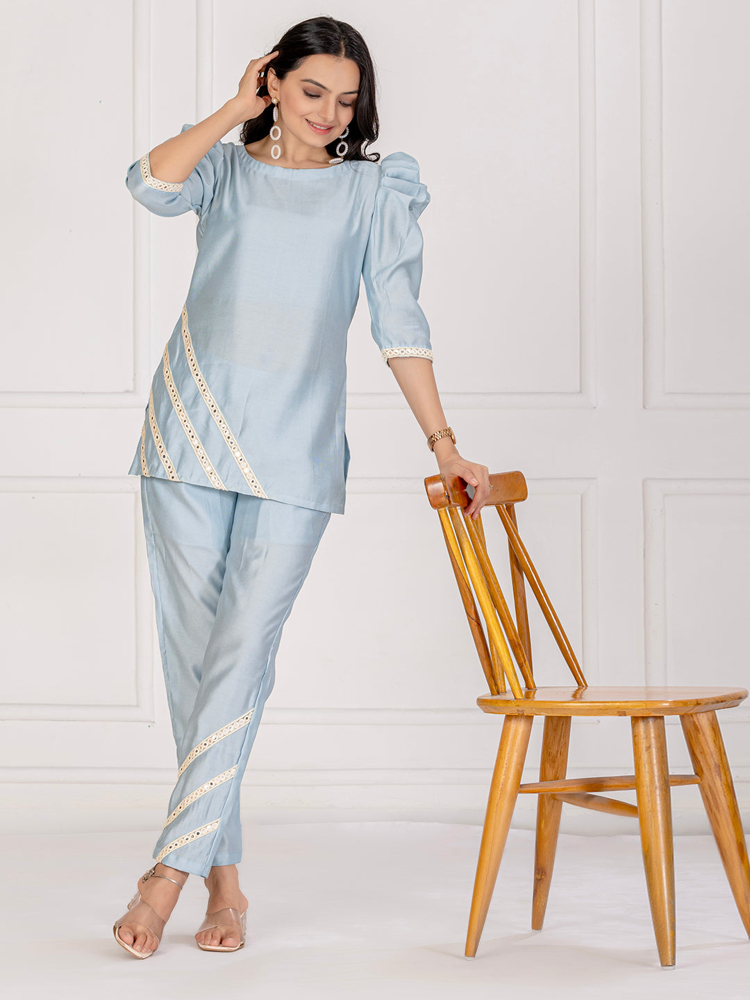Elegance meets comfort in this stunning blue coord set crafted from a soft viscose blend. The top features puffed sleeves and delicate mirror lace detailing along the arms and hem, while diagonal lace stripes add a touch of grace to both the top and the matching pants. Designed for ease and sophistication, this set is perfect for festive gatherings or elevated everyday wear.