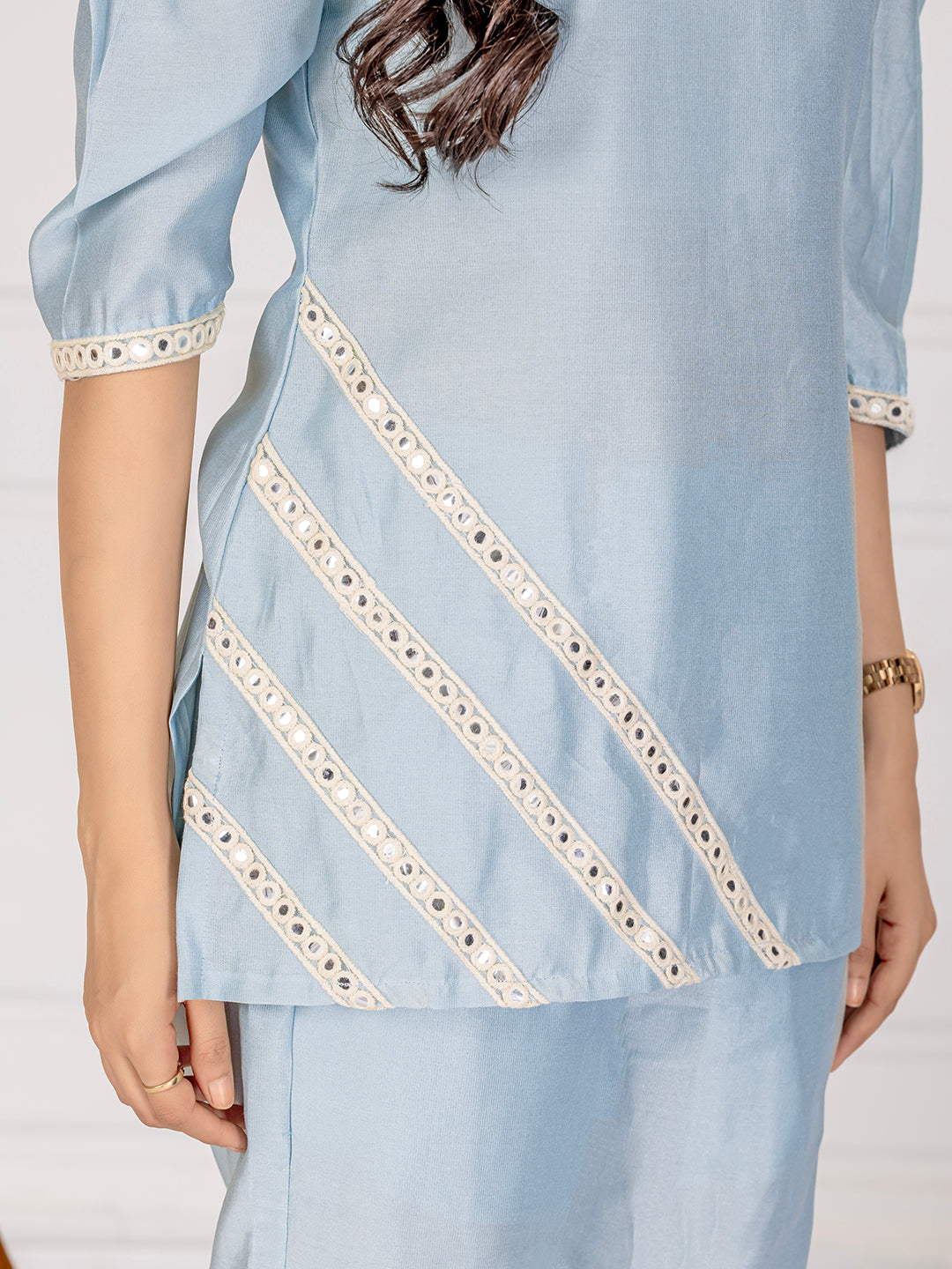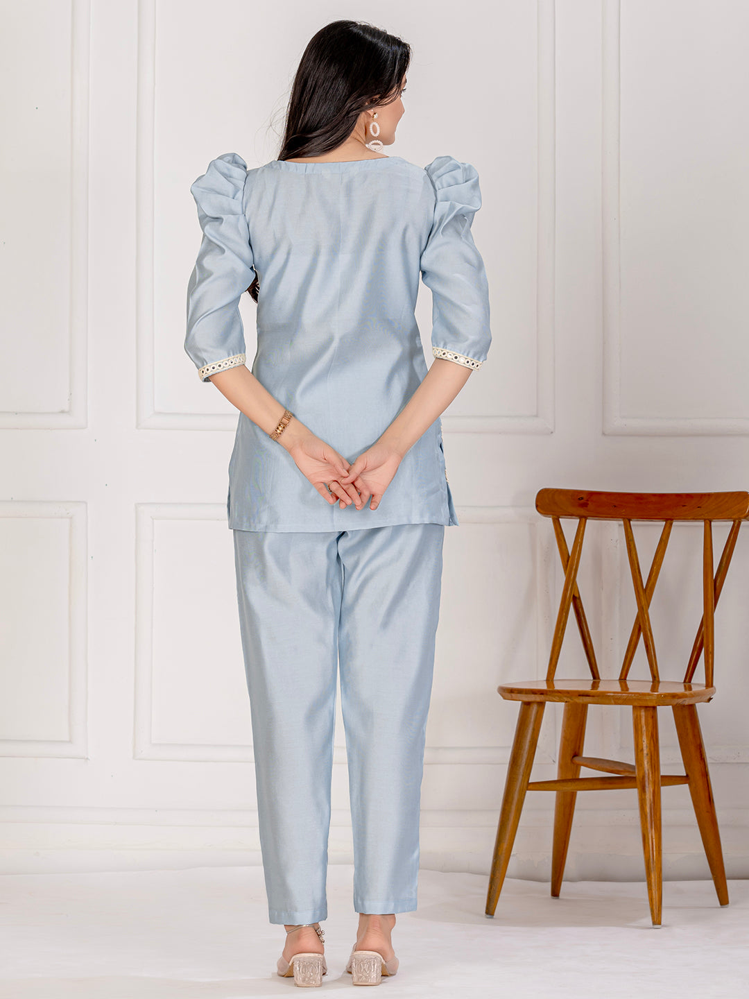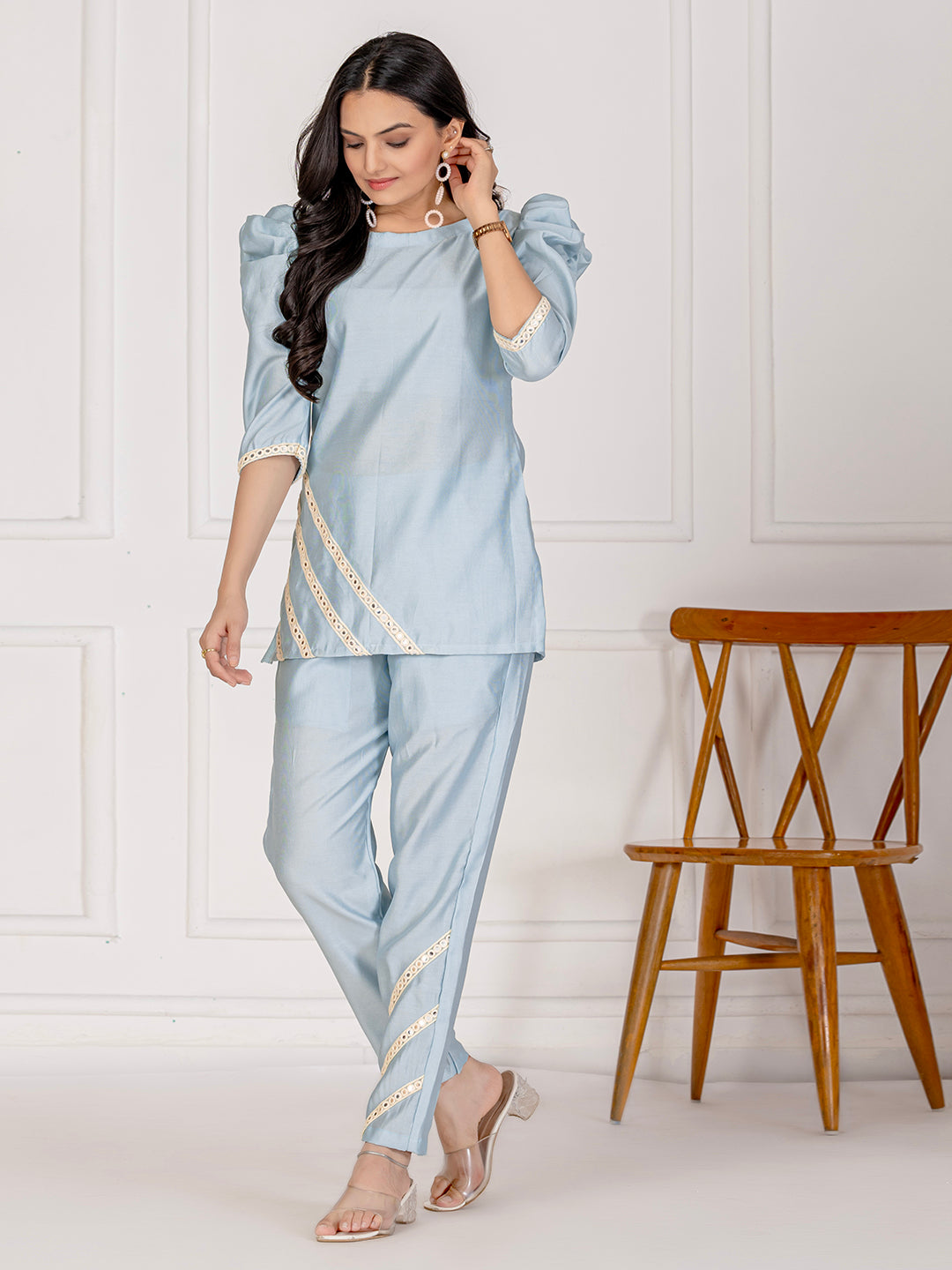 Elegance meets comfort in this stunning blue coord set crafted from a soft viscose blend. The top features puffed sleeves and delicate mirror lace detailing along the arms and hem, while diagonal lace stripes add a touch of grace to both the top and the matching pants. Designed for ease and sophistication, this set is perfect for festive gatherings or elevated everyday wear.