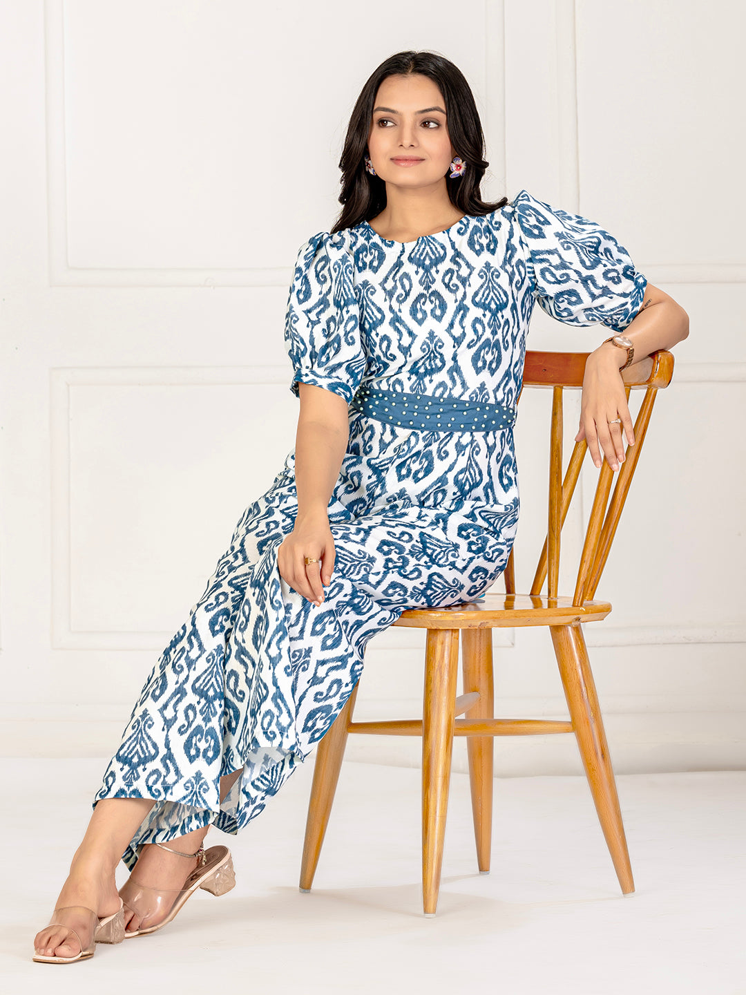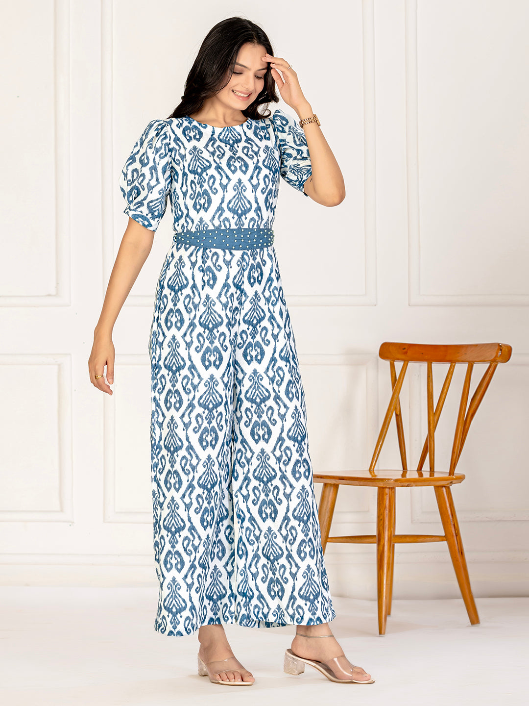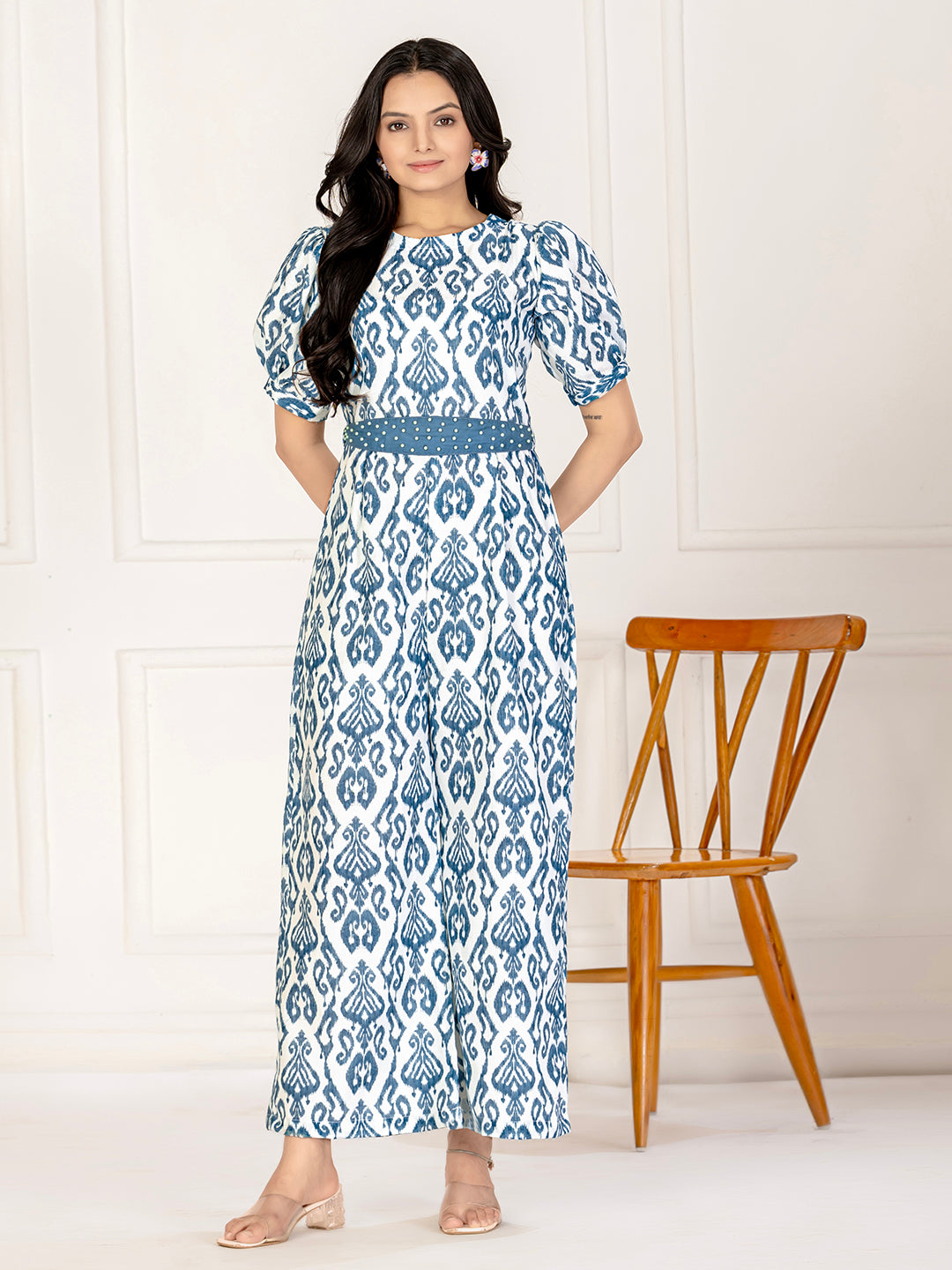 Step into effortless elegance with this beautifully crafted cotton ikat jumpsuit. Featuring a traditional ikat weave, the jumpsuit blends artisanal charm with modern design. The lightweight cotton fabric ensures all-day comfort, while the flattering belt at the waist adds definition and style. Perfect for casual days or semi-formal gatherings, this jumpsuit offers a versatile and contemporary look.