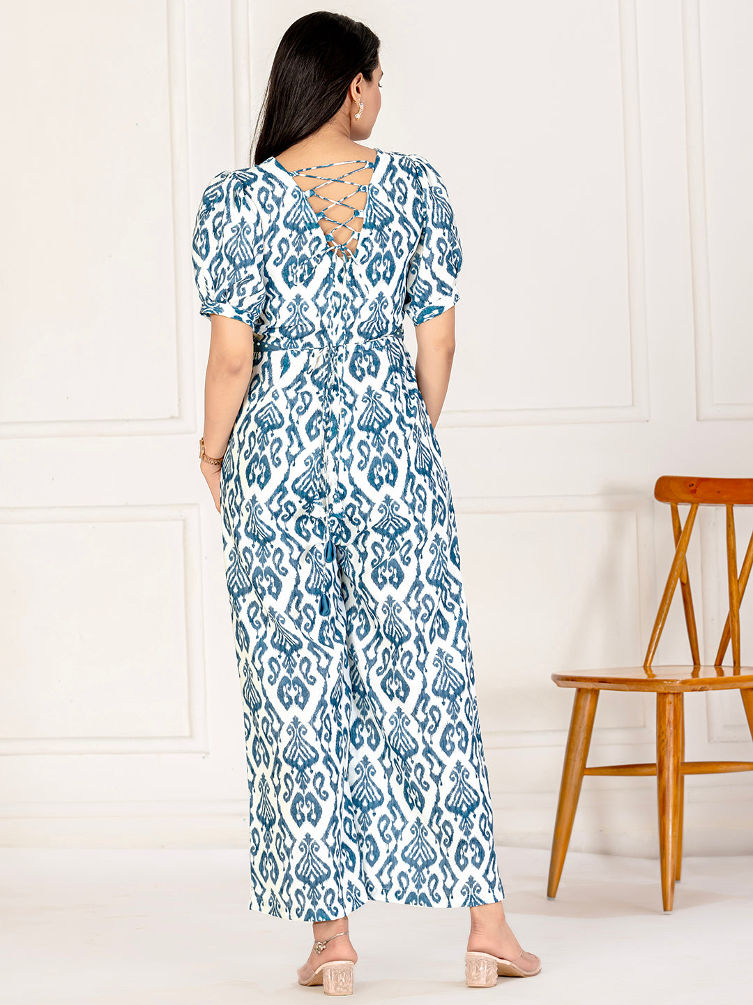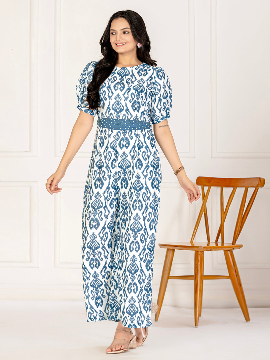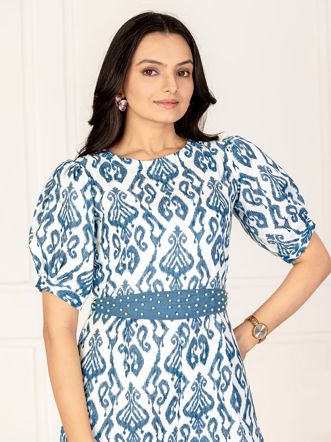 Step into effortless elegance with this beautifully crafted cotton ikat jumpsuit. Featuring a traditional ikat weave, the jumpsuit blends artisanal charm with modern design. The lightweight cotton fabric ensures all-day comfort, while the flattering belt at the waist adds definition and style. Perfect for casual days or semi-formal gatherings, this jumpsuit offers a versatile and contemporary look.
